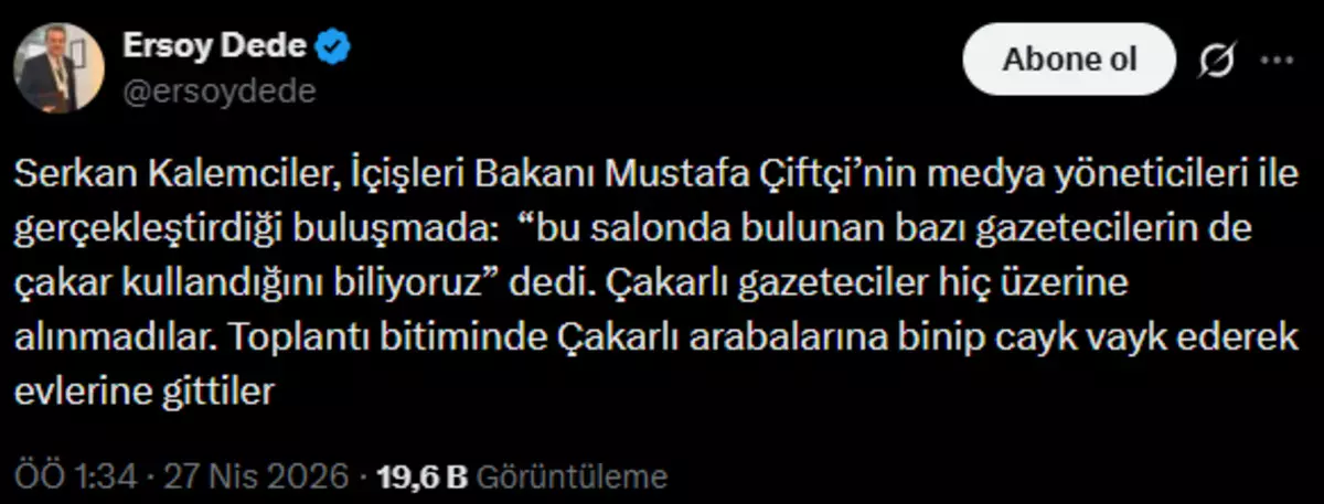 Paylaşımında, “Çakarlı gazeteciler hiç üzerine alınmadılar” ifadesine yer veren Dede, toplantı bitiminde bu kişilerin çakarlı araçlarıyla ayrıldığını yazdı. Böylece toplantı sırasında gündeme gelen tartışma, toplantı sonrasında da sosyal medyada konuşulmaya devam etti.