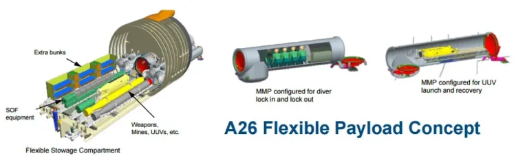 ⁃ Özel Torpido Dairesi: Blekinge Sınıfının torpido dairesi standart denizaltılara göre oldukça farklı olarak tasarlanmış. Flexible Payload multimission portal olarak adlandırılan bu alanda çok büyük, aslında denizaltıların güvertesinde görmeye alışkın olduğumuz SAT intikal araçlarını taşımaya yarayan pusis (dry deck shelter) ları andıran büyük bir kovan yer alıyor. Bu hazne, Sovyetler’in Piranha Sınıfı özel hareket denizaltılarında ve Pakistan’ın CosMoS sınıfı mini denizaltılarında yer alan hazneye benzer şekilde tasarlanmış. Mukavim teknenin baş kısmında yer alan ayrı bir mukavim bölme şeklinde, SAT komandolarının denizaltıya sualtında kolay giriş çıkış yapabilmelerini sağlayan bir üstüvane olarak kullanılabildiği gibi çeşitli tiplerde insansız sualtı araçlarının da bu hazneden denizaltıyı terk etmesi mümkün oluyor.