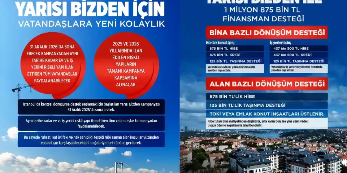 İstanbul’da olası deprem riskine karşı yapı stokunun yenilenmesini hedefleyen kampanya, özellikle riskli yapıların dönüşümünü teşvik ediyor. “Yarısı Bizden” modeliyle devlet desteği sağlanırken, mali yükün önemli bir bölümü kamu tarafından karşılanıyor. Bu sayede hem bireysel mülk sahiplerinin finansman yükü hafifletiliyor hem de dönüşüm süreci hızlandırılıyor.